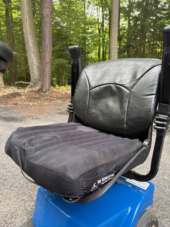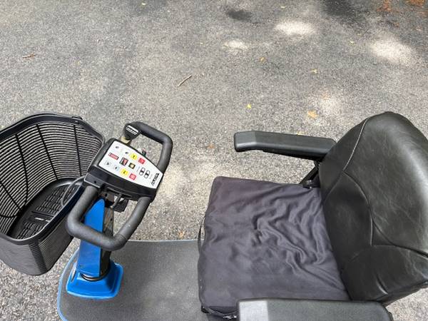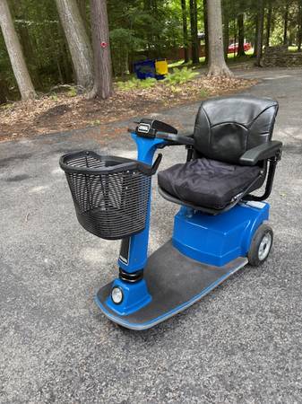 Blue Amigo 3-wheeled mobility scooter. Purchased in 2017, used for approximately 3 months and has been in storage. NEW BATTERIES. Includes a basket and Roho inflatable cushion.