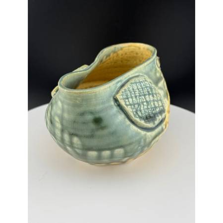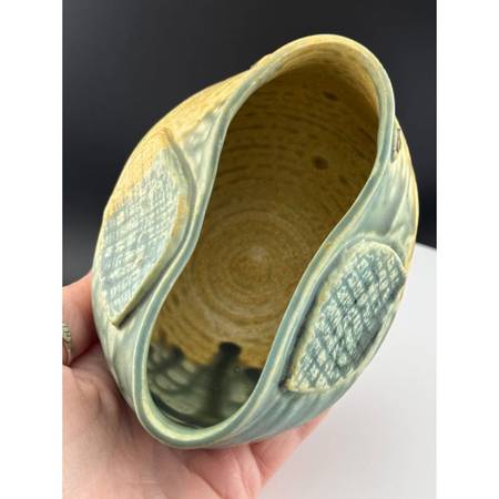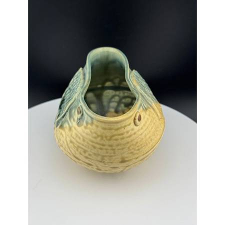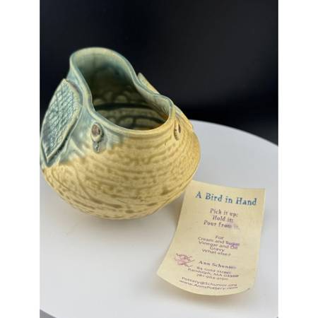 This charming pottery bowl combines functionality with artistic flair. Its unique bird-inspired design stands out with captivating blue and tan hues that evoke a sense of nature. Perfect for holding cream, sugar, or even a stunning bouquet, it enhances any tabletop. The smooth contours and detailed textures make it a delightful conversation piece. Handcrafted with care, it brings warmth and character to your home. Embrace the art of pottery with a piece that’s as versatile as it is beautiful. 3.25" tall, 4.75" long and 4" wide.