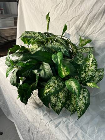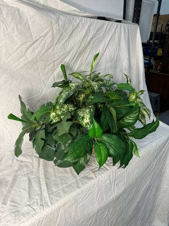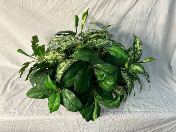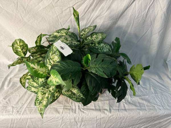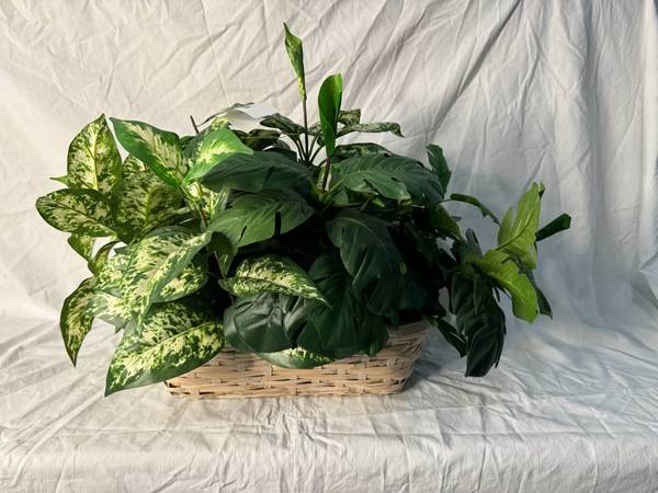 Realistic-looking faux pothos & monstera in a white wicker basket. I like this one so much, it's by my desk until it sells! Approximately 17" tall and 22" wide.