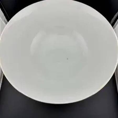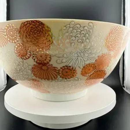 Jaw-droppingly gorgeous 10" diameter serving bowl. Soft peach background with white and orange mums. Gold accents. What a beautiful statement piece for your table scape. No stamp or maker's mark remaining. One small dark spot in bottom of bowl (see pictures).