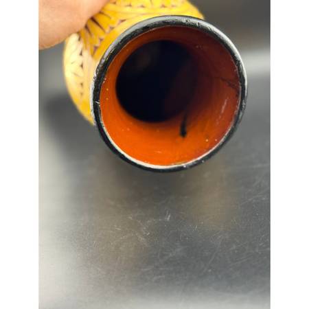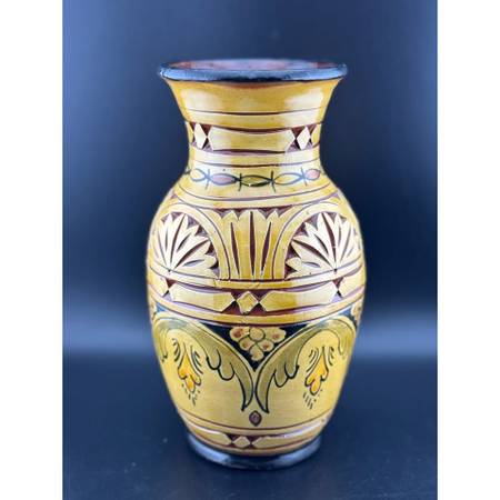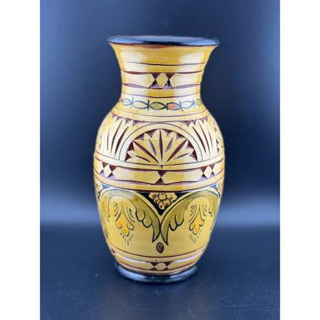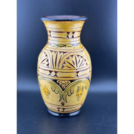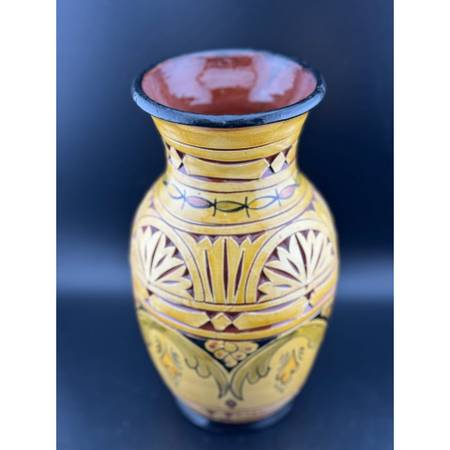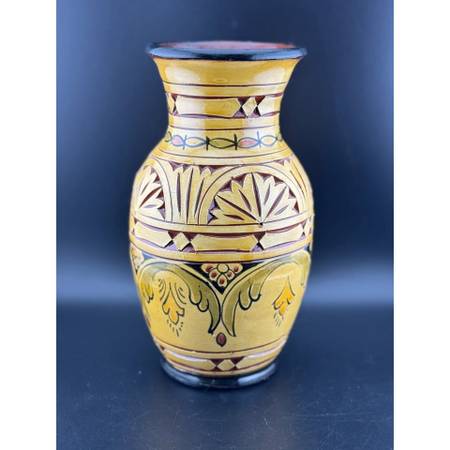 A beautifully crafted ceramic vase featuring intricate patterns and vibrant colors. Its eye-catching design makes it a perfect decorative piece for any space. The combination of cheerful yellow with bold black accents adds a touch of artistic elegance. Hand made in Morocco. 9" tall with a 5.25" diameter.