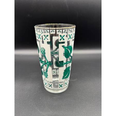 Set of vintage Hazel Atlas Green Ivy glass tumblers featuring a charming green and white leaf design. These glasses combine practicality with retro elegance, perfect for serving your favorite beverages. Their intricate pattern adds a touch of nostalgia to any table setting. Ideal for both casual drinks and eye-catching table displays. Set of 8.