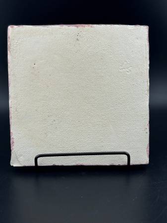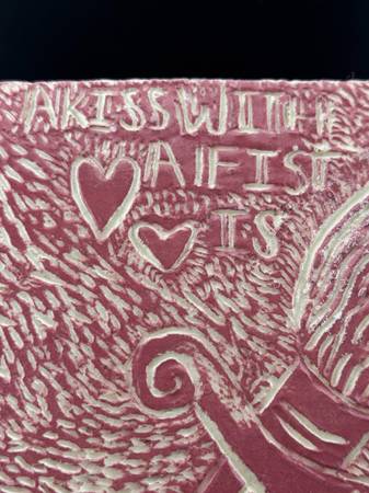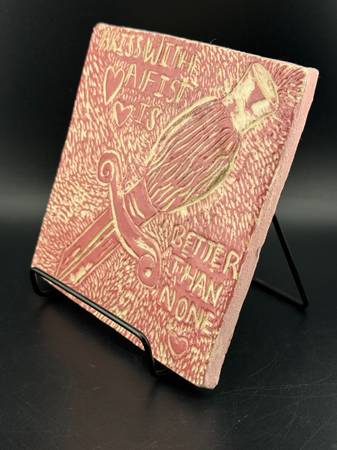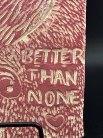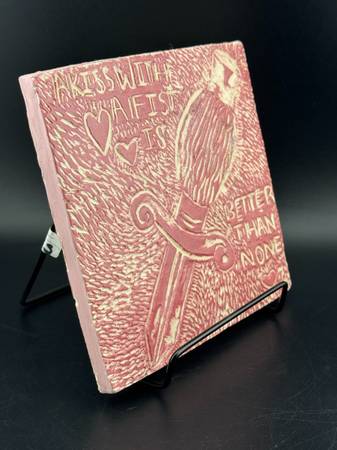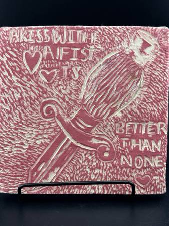 This handcrafted ceramic tile features a kitschy, artistic design with a sword and a quote that says, "A kiss with a fist is better than none.". Its textured surface and soft pastel hues make it a unique piece to add personality to any space. Approximately 5.5" square.