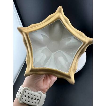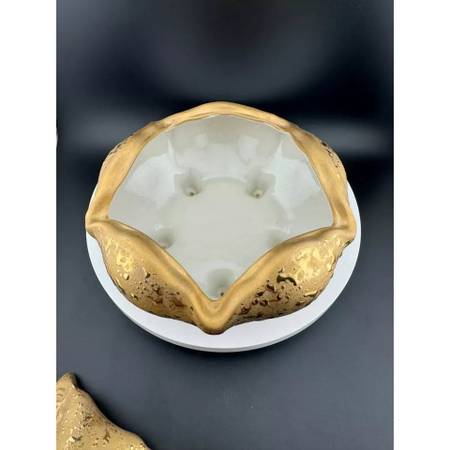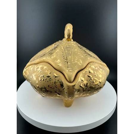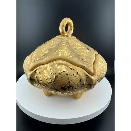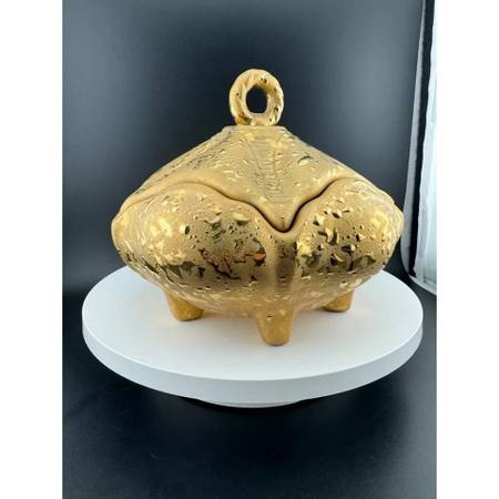Lovely weeping gold ceramic pieces available! No makers marks, stamps or tags. The bowl stands on 4 feet, with lid, at 6" tall with a 6.5" diameter.