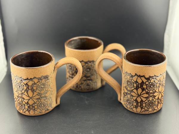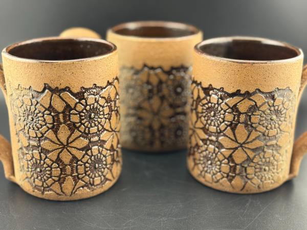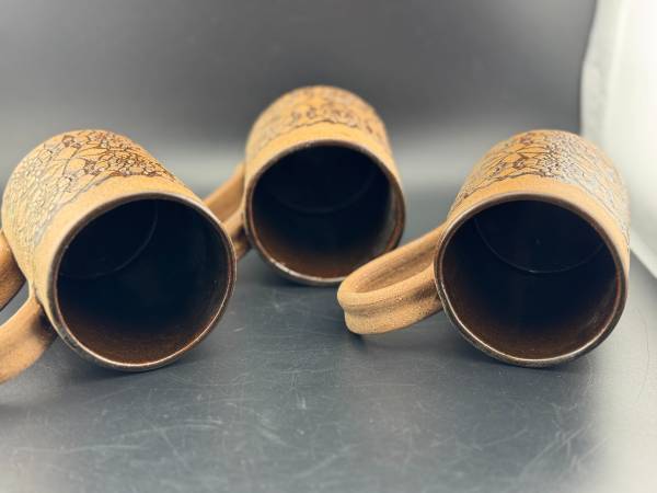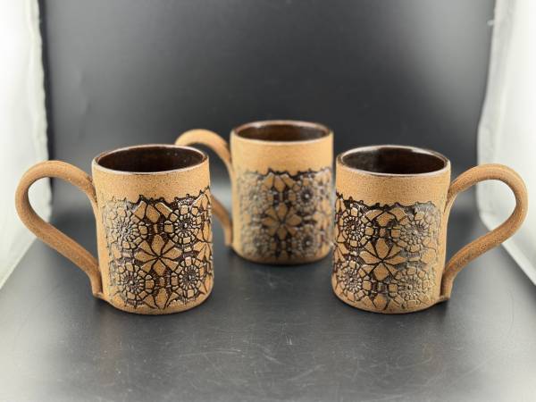 Set of three ceramic mugs featuring intricate floral patterns in natural browns. These mugs add a touch of artistry to your daily coffee or tea ritual. Each mug has a comfortable handle and a glossy interior, making them both functional and stylish for any kitchen. 3.75" tall with a 3" diameter.