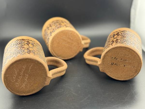 These studio pottery mugs signed by NY artist Carol Adamec Marsham (currently exhibiting work as simply Carol Adamec). Adamec is a living contemporary artist based in Camillus, NY. Her work has won numerous awards and is part of multiple permanent university collections. Learn more about Adamec and her work here: https://www.sculpture-homeandgarden.com/information