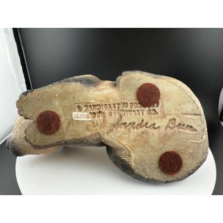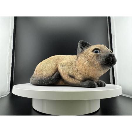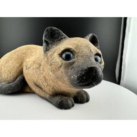 Sandicast crouching Siamese cat with blue eyes by Sandra Brue, 1982. Good overall condition with some wear on the paint (common in these pieces based on research). No major flaws, ships or cracks. Adorable piece for any Siamese kitty lover!