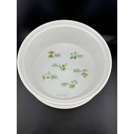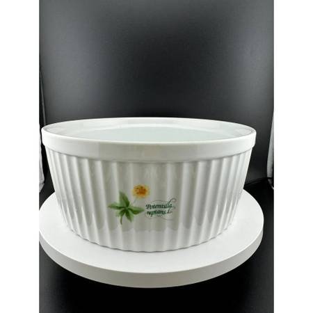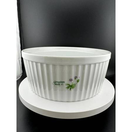 Lovely, pristine Floret pattern 1.5 quart soffle dish by Anchor Hocking. Natural white with fluted sides, 4 flowers printed on the outside and 6 printed inside. Darling addition to any vintage, witchy or cottagecore kitchen. Oven safe. Microwave safe. Floret - C8404/551. 3" tall, 7.5" diameter.