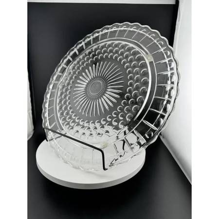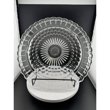 Stunning Federal Glass footed cake plate. Lovely sunflower surrounded with bubbles/dots (looks like bubble wrap) and a scalloped edge. Approximately 11.25" diameter. The feet a teeny tiny and the plate stands less than 0.75" tall.