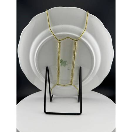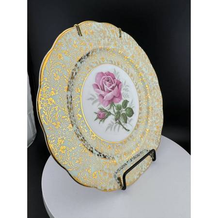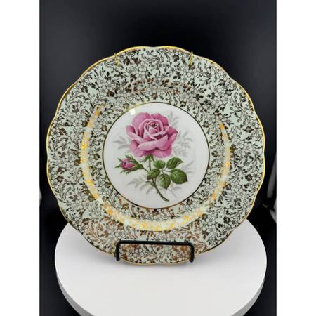 GORGEOUS 8" plate with a scalloped edge and a pink rose surrounded with a minty green and gold floral pattern. Royal Standard Fine Bone China, England. Includes the pictured plate hanger.