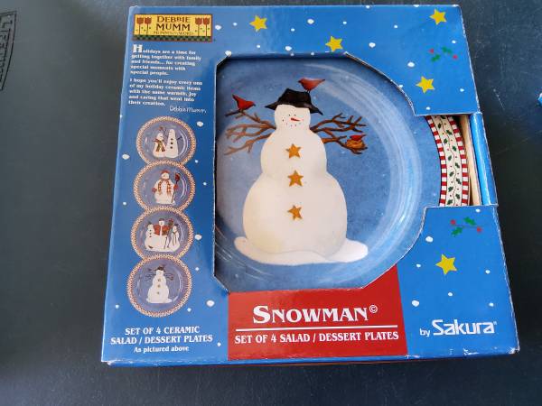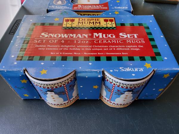 Debie Mumm Snowman collection 3 sets of 4 different artwork 1 set consists of 4 - 12oz ceramic mugs A total of 12 mugs 1 set consists of 4 - 8" ceramic plates A total of 12 plates...