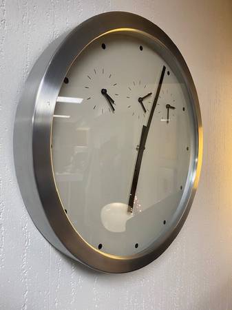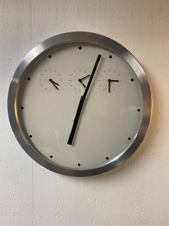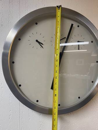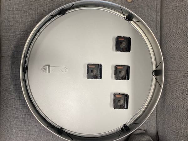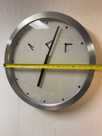 20" diameter Large Analog Wall Clock with Multiple Time Zones. Brushed Aluminum & Glass. 2.375" thick aluminum. 4 different time zone. Battery operated.