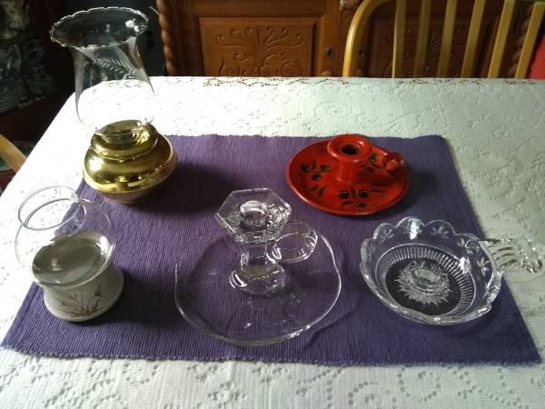 PARTYLITE, Lead Crystal Candle Holder, New with Box. $10 Princess House Glass on Brass Base Candle Holder. $5 Glass Candle Holder. $5 Pottery Base Candle Holder. Sold Toll Painted Candle Holder. $5...