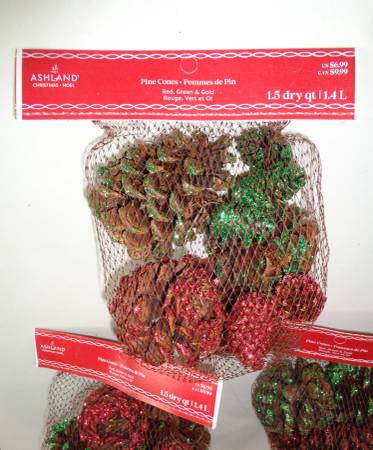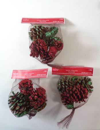 No shipping. Pick up in Irondequoit near Rochester General Hospital. New. 3 bags of pine cones painted with glitter. All for $5.