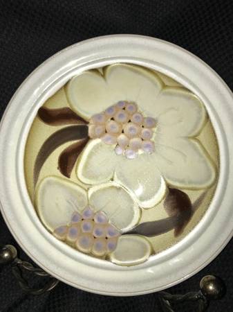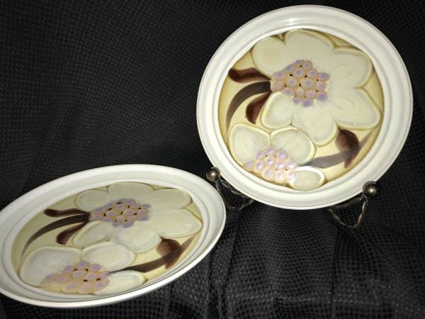 Beautiful set of two Noritake Folkstone Oriental Garden dinner plates featuring an elegant white floral design on earthy stoneware. These plates measure 10 inches in diameter and are in excellent condition with no chips, cracks, or crazing.