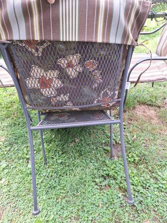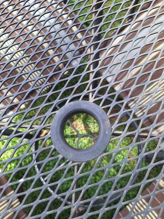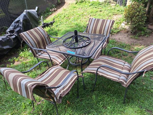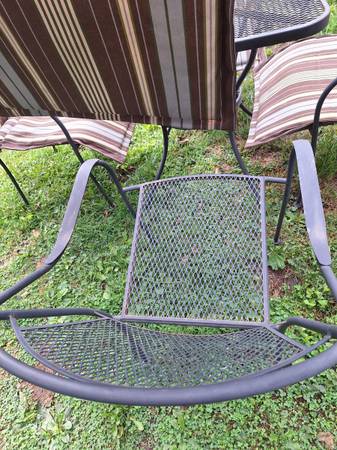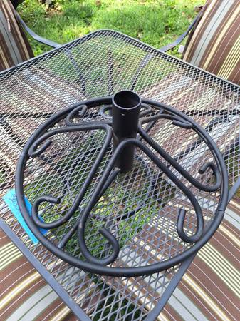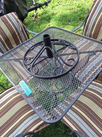 Solid Wrought Iron Mesh Wire table table and chairs with matching umbrella stand great shape everything is strong