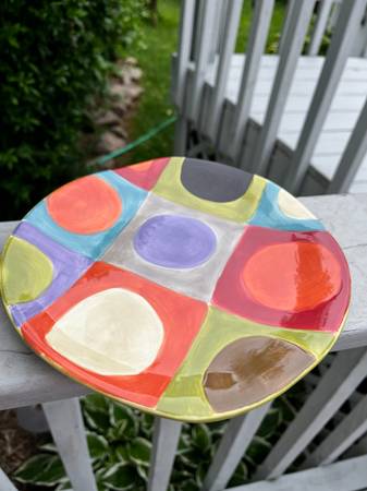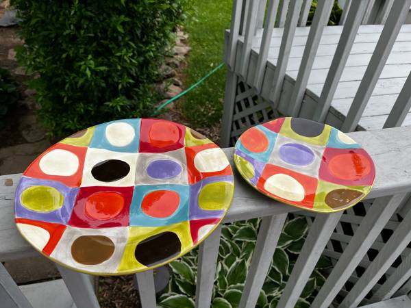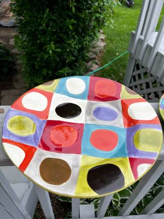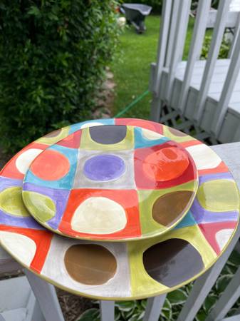Beautiful and vibrant Urban Dot plates from Pier 1 Imports. These hand-painted earthenware plates feature a bold, multicolored patchwork design with circular accents—perfect for adding a fun pop of color to your table décor or for display.