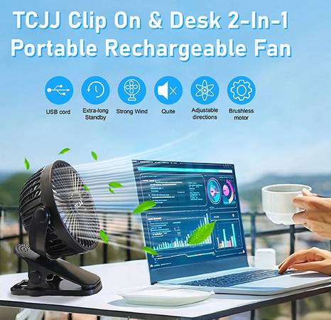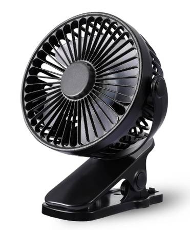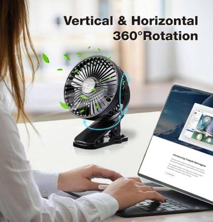 Take anywhere portable fan. Can be put/clip/hang anywhere with 360° vertical and 360° horizontal rotation. Has a replaceable and rechargeable 1200mAh battery (included), that can last from 2.5 to 4 hours (depending on speeds), and can be used while charging from a computer, power bank, USB charger, or any USB power source. Includes charging cable. Compact design (5.3 x 2.5 x 6.5inch).