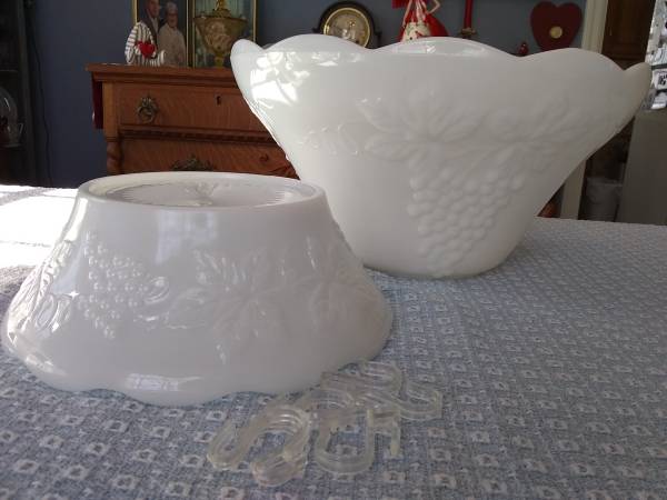Milk Glass Punch Bowl with Grape and Leaf Motif Base Base can also Serve as a Bowl Includes 9 cups, 7 Hooks for Hanging Cups and 1 Plastic Ladle 2 Chipped Cups Included Great for Fruit Salad for...
