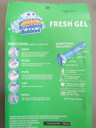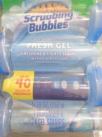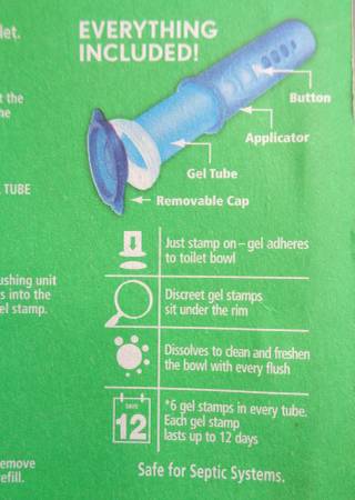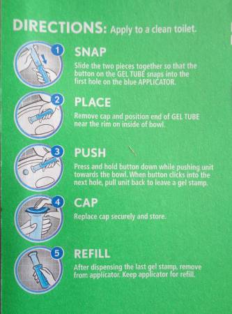 Stamp dispenser with 24 gel stamps. Use the stamp dispenser and stamp 1 of the toilet cleaning gel stamps under the rim of the toilet bowl. Each stamp lasts up to 12 days. Fresh rainshower scent.
