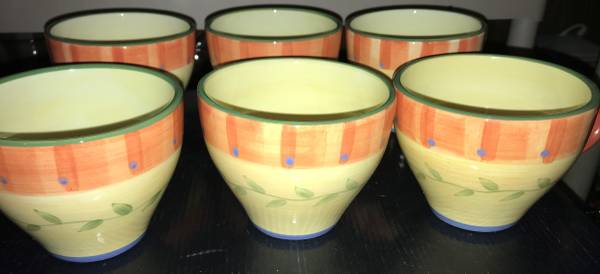 Bright, cheerful, and hand-painted in the signature Napoli colors—soft yellow, warm terracotta, leafy green, and blue accents. These generously sized Pfaltzgraff mugs are perfect for coffee, tea, cocoa, or soup. All six are in excellent condition with no chips or cracks.