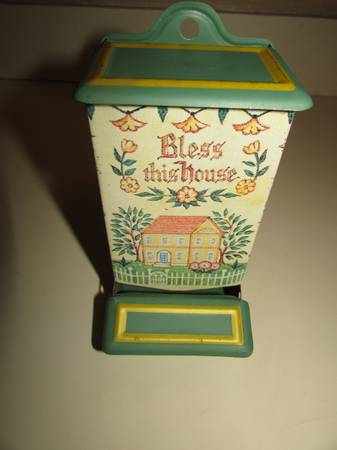 Vintage Jasco made in Hong Kong "Bless This House" tin matchbox holder cottage. 6" x 3" x 3.5". Very good shape. Just a bit of wear. I'm in West Irondequoit by the lake. Call or text or use...