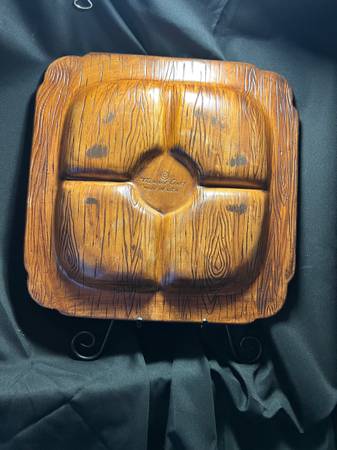 Beautiful vintage Treasure Craft divided serving platter, featuring a striking bright yellow glaze interior contrasted with a woodgrain-style brown ceramic border adorned with sculpted fruit and leaf designs.