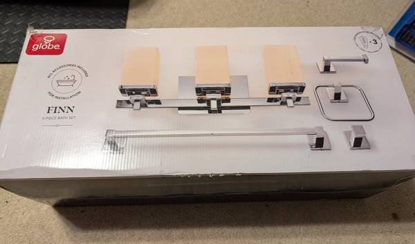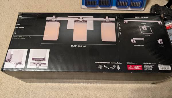 New in original, unopened packaging Vanity Light w/ Chrome finish, Frosted glass shades Towel bar Towel ring Robe Hook Toilet paper holder All items are sold as is, cash only, no delivery, returns...