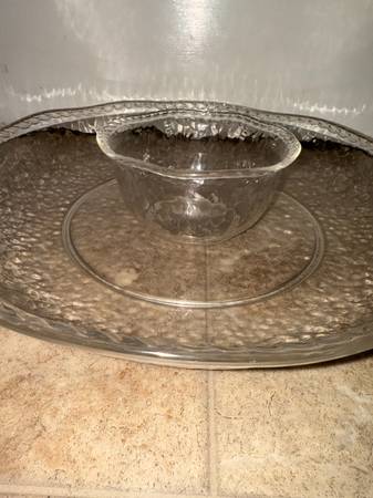 chip and dip trays, 2 of them one with the dip in the middle is made by Pottery Barn 15" diameter, dip container is 6" diameter one with dip in the side is made by Crofton. 15" diameter, dip...