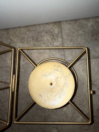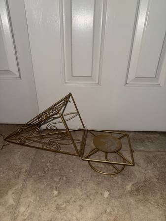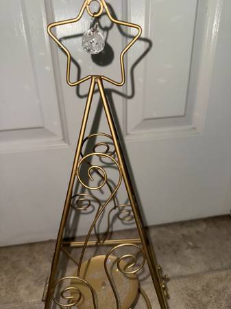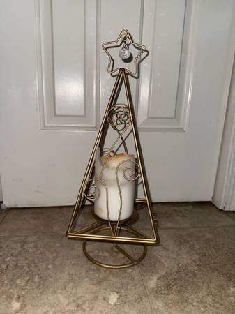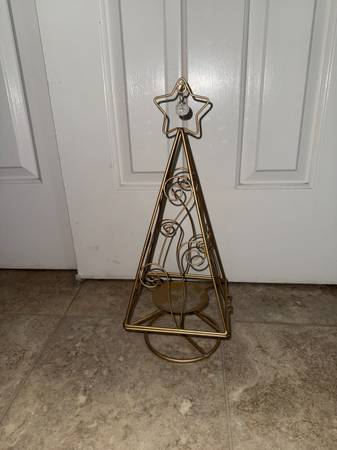 gold sparkle Christmas tree candle holder top opens up and there is a post to hold the candle. candle not included willing to meet Victor/ Farmington