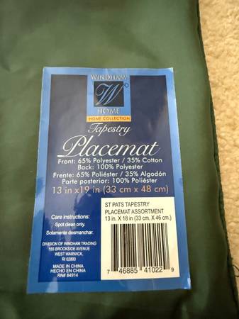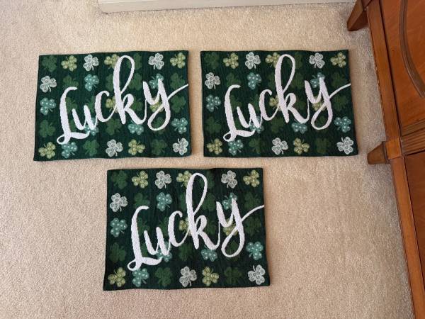 3 St. Patrick's Day placemats 13" x 9" 65% polyester/ 35% cotton spot clean only willing to meet Victor/ Farmington smoke free home