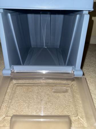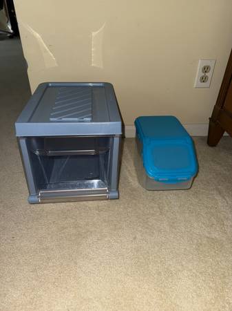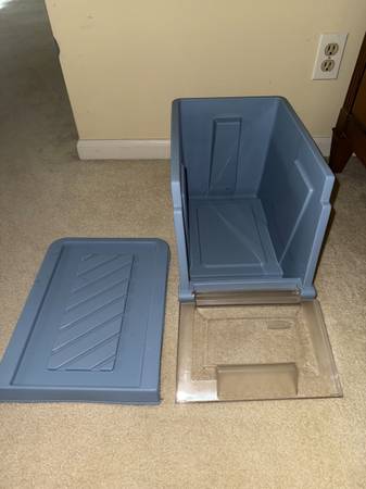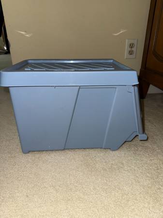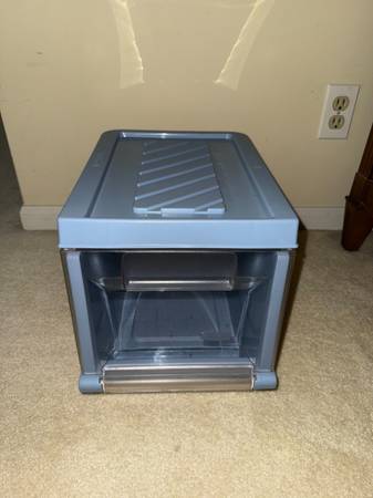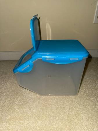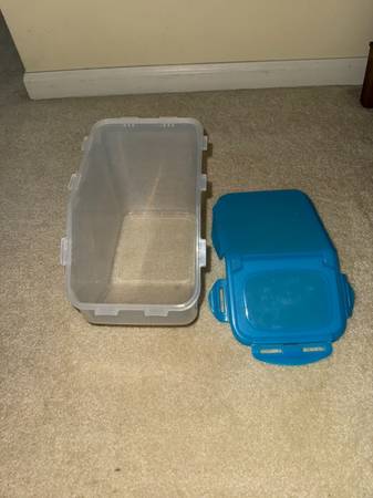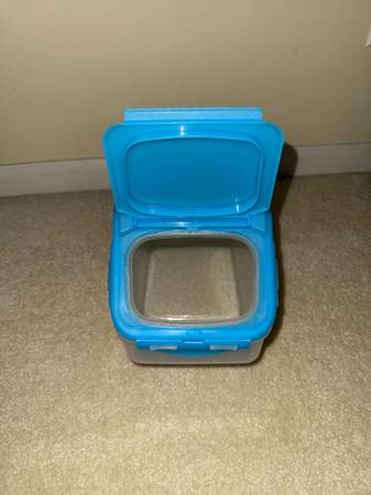 light blue with clear door is by Rubbermaid, tops come off 13.5" long, 10" high, 10" wide blue top, clear bottom is made by Lock and Lock. dishwasher safe, freezer safe size: 5.3 quart, 5L $5 each...