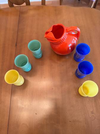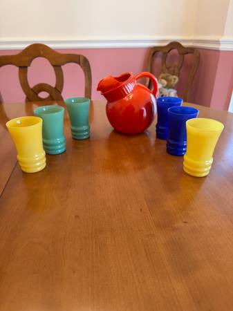 Fire King Rainbow Tilt Ball Style Glass Pitcher (6 1/2"H) and 6 Glasses (4" H). Vibrant Colors. Will Ship Please call If it's posted its available.