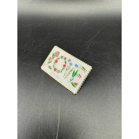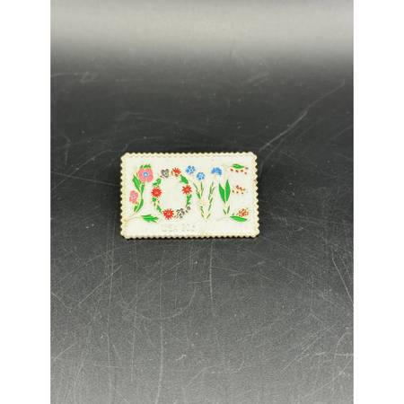 This charming enamel $0.20 stamp pin features a vibrant floral design spelling out 'LOVE,' perfect for sending affectionate messages. The intricate details in shades of red, blue, and green create a delightful visual appeal. Made by Jayne Co. in 1982.