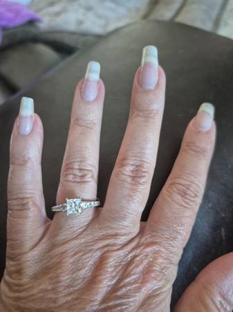 White gold engagement ring. Beautiful/Brilliant princess cut center stone. NEVER WORN!! I have the bag that it came in. The receipt, the teddy bear, box, grading summary. Everything about the ring...