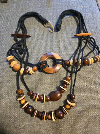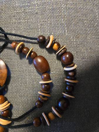 Wood & cord necklace, vintage, black cord, brown and cream beads.