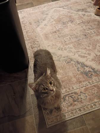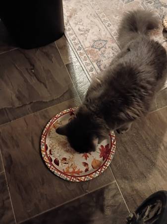 This beauty walked right in my house a few days ago. I fed her and kept her here . I have a very territorial male senior dog. She was starving. So gentle and friendly. I don't know the age. Litter trained,not declawed.