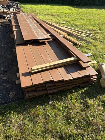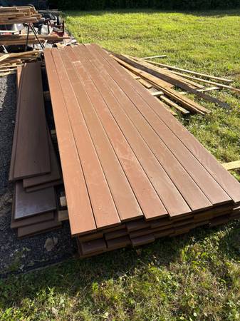 Couple years old but never installed. 42 six inch by (5 1/2” actual) sixteen foot pieces (336 sq. ft.). 8 ten foot facia pieces. Non-skid wood grain finish. Color matched screws included. Two boxes of 100 screws per box for facia and three boxes three hundred screws per box for deck. Approximately 1/3 of what it is currently selling for at big box stores. Russ 58fiv-73for-55six8.