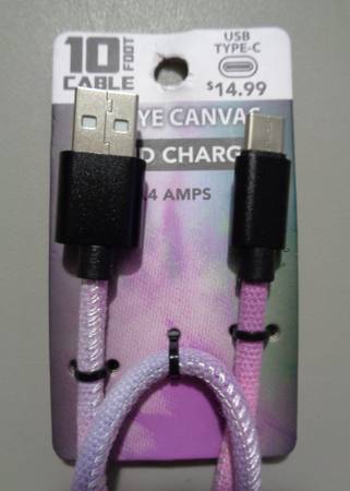 No shipping. Pick up in Irondequoit. New. 10 foot braided tie dye canvas cable. For USB Type-C phones and devices.