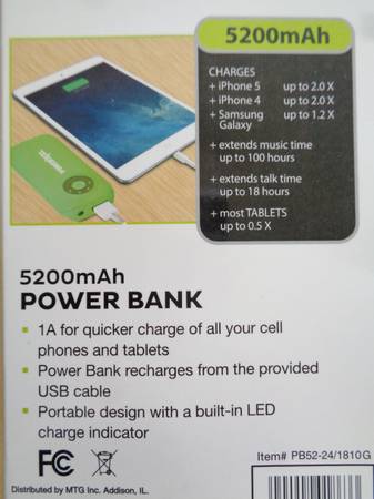 No shipping. Pick up in Irondequoit. New. Open box. 5200mAh capacity. 1A output. With USB-A to Micro-B cable.