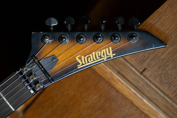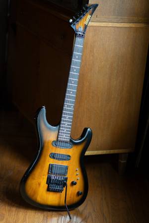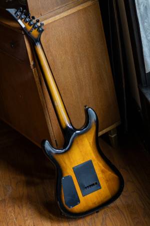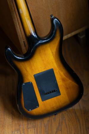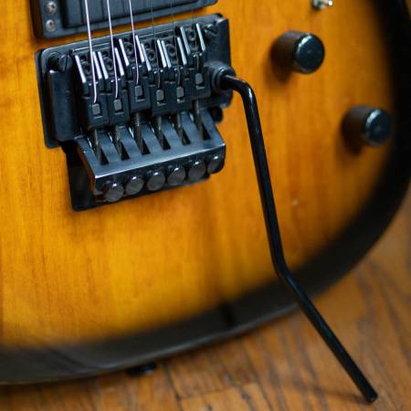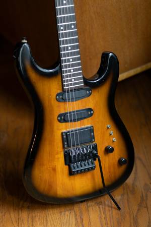 From the mid-1980's, the Schecter Strategy guitars were aimed at hard rock / metal players. It has the obligatory pointy headstock and a tobacco sunburst finish. This one has been modified: the original Jinah Bennder tremolo bridge crumbled (typical pot-metal failure). The new bridge is a licensed Floyd Rose model from GFS. Includes a gig bag.