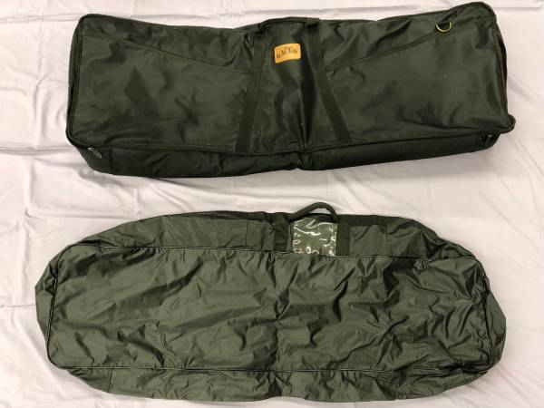 Smaller case measures 8" x 12" x 46" with zippered opening and single handle. Vinyl material (Yamaha?)