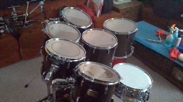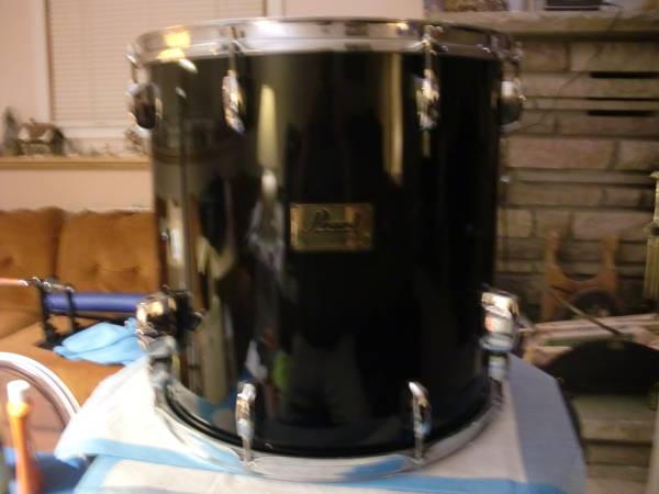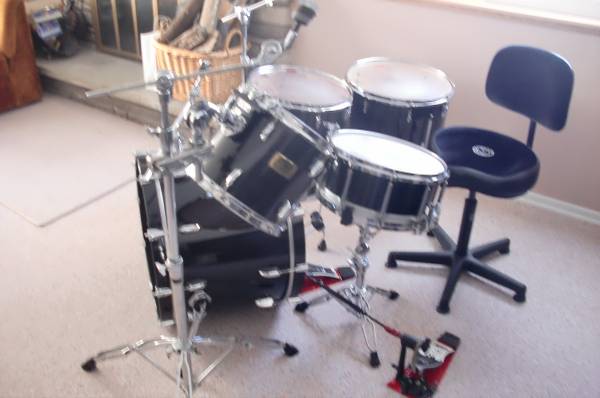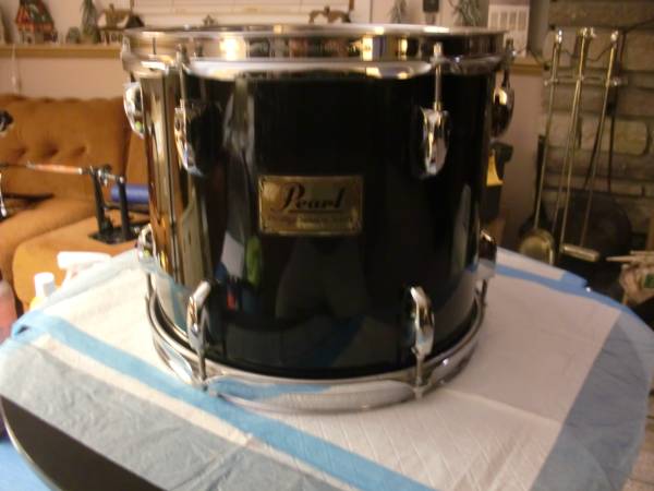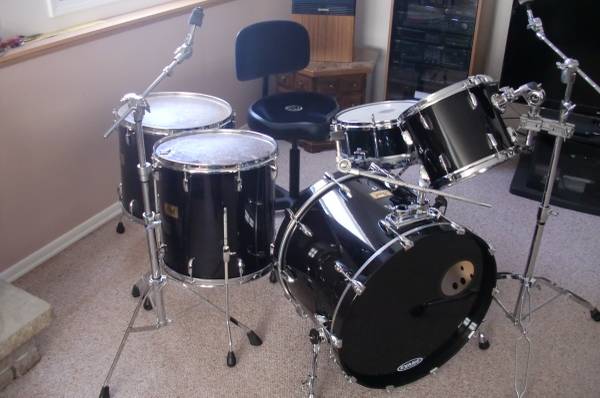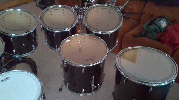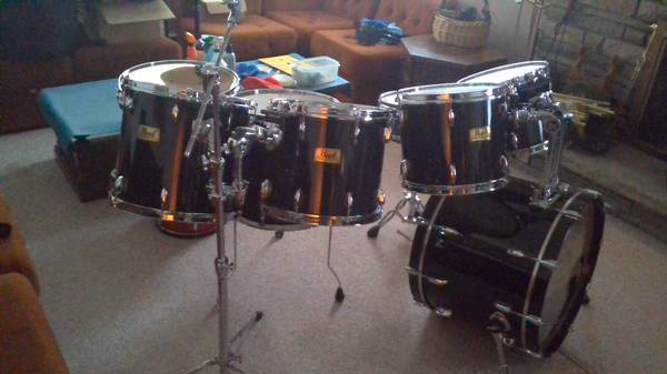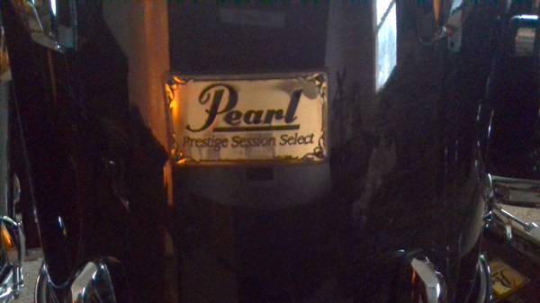 Pearl Prestige session select shell pack, 22" Bass 12, 13, 14, 15" mounted toms 16, 18" floor toms, Maple and Mahogany blended shells, Beautiful Amber Mist Lacquer black with light grey highlights painted finish, (not wrapped) all bearing edges are immaculate, Evans EQ pad system and heads on BD, new heads on all drums, soft cases for all drums except 18"Floor tom, Pearl stand with Tama collapsing boom top and all arms and ISS mounts included these drums are from the mid 1990s are in Excellent condition and sound even better than they look, This would be a perfect set for a Studio!!! will throw in 10 lug snare and Pearl snare stand for the right deal.