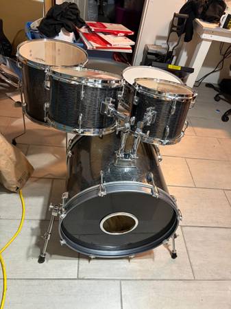 This is a Basix kit that was the standard horrible red. I rewrapped the shells. The sizes are 10, 12, 14, 20 poplar shells with a 14x5" steel snare. The snare is a no name brand snare that fixed up with new heads, snare wires, and throw off. The throne is a pdp brand. I don't know what brand the snare stand is. The drum heads are all new despite what the pictures show. They make it look way worse than they actually are. I have only played this kit a couple times and its taking up space. Plus I have bills I have to pay or else I would not be selling it. For an extra $50 I can Throw in a brand new double chain kick pedal.