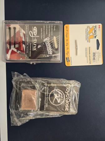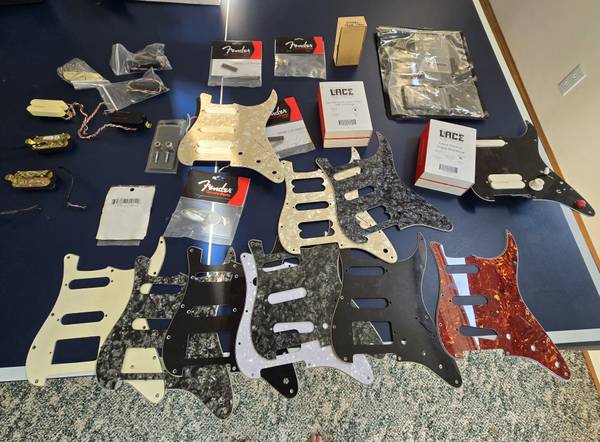 I have... Emg 81 85 pickups Tusq xl strat nut Floyd rose 37mm tungsten block Evh d tuna Lace sensor guitar pickups Stratocaster pickguards Loaded strat pickguards 2 oem evh bridge humbuckers Fender...