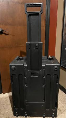 This is a heavy duty injection molded SKB Flyer Rack Case w/ rack shelf that is in great condition. The top section has a 15” x 20” adjustable work surface and the rack shelf is 13” x 17.5”.