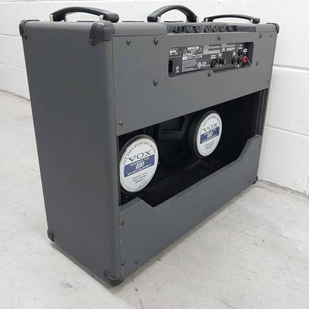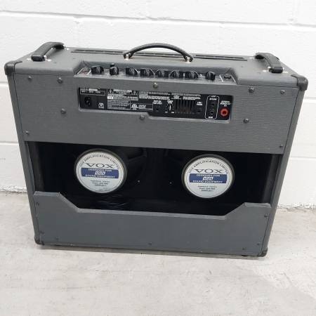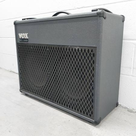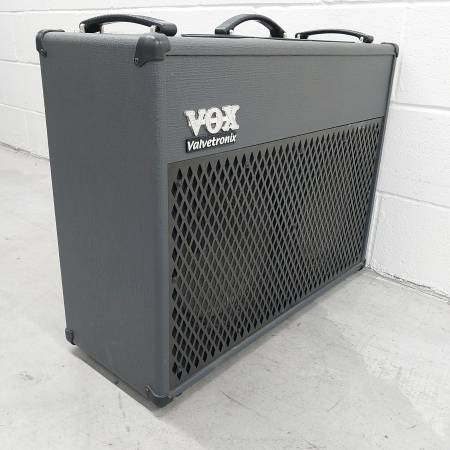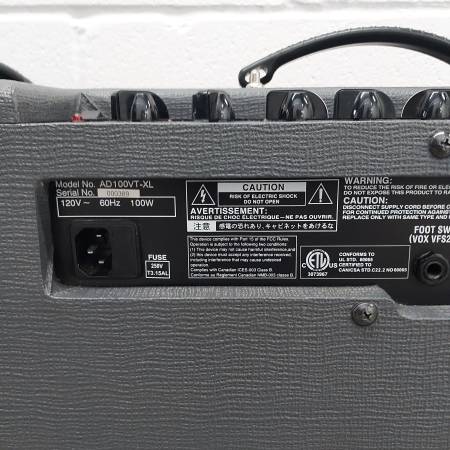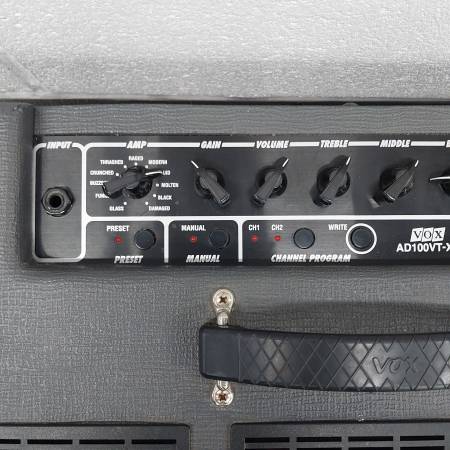Introduced in 2007, the AD100VT XL was the "big daddy" of the AD Valvetronix XL Series of amplifiers. It featured two 12" Vox special design speakers in an open back, pressed board cabinet powered by a 100 watt, 12AX7 tube/solid state hybrid Valvetronix amplifier circuit. The control panel was loaded with controls for eleven amp models, eleven pedal effects and a two channel digital programmer.