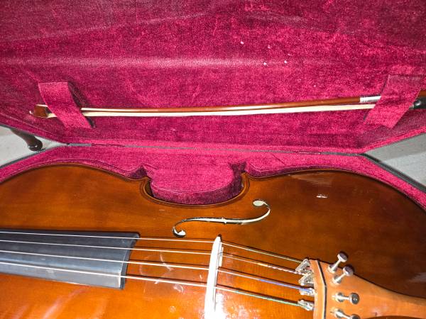 Cecilio CC-300 solid wood, full size cello. Boxwood pegs and tailpiece. Brand new Brazilwood bow. Lightweight hard case with wheels. Excellent condition. Ready to go.