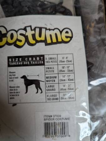 New in the package, dog Halloween costume of a spider in a dog size medium. Back measurement would be 14 to 17" $10 cash only, No emails, please call or text