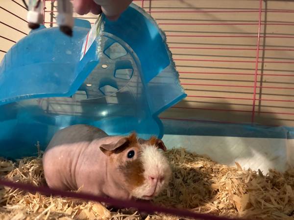 Meet Ludwig Von Pigtoven, aka Ludie. Ludie is a 1.5 year old hairless guinea pig and proven breeder. Ludie is a beautiful rainbow boar with very unusual coloring. He is hand tamed and will gently take treats from your hand. He is a retired breeder and ready for his forever home. Ludie will come with his ‘pigloo’ (where he sleeps, as well as some food to help him transition. Hairless guinea pigs are easy to take care of and very sweet. Rehoming fee negotiable for the right person. Please message me with any questions.